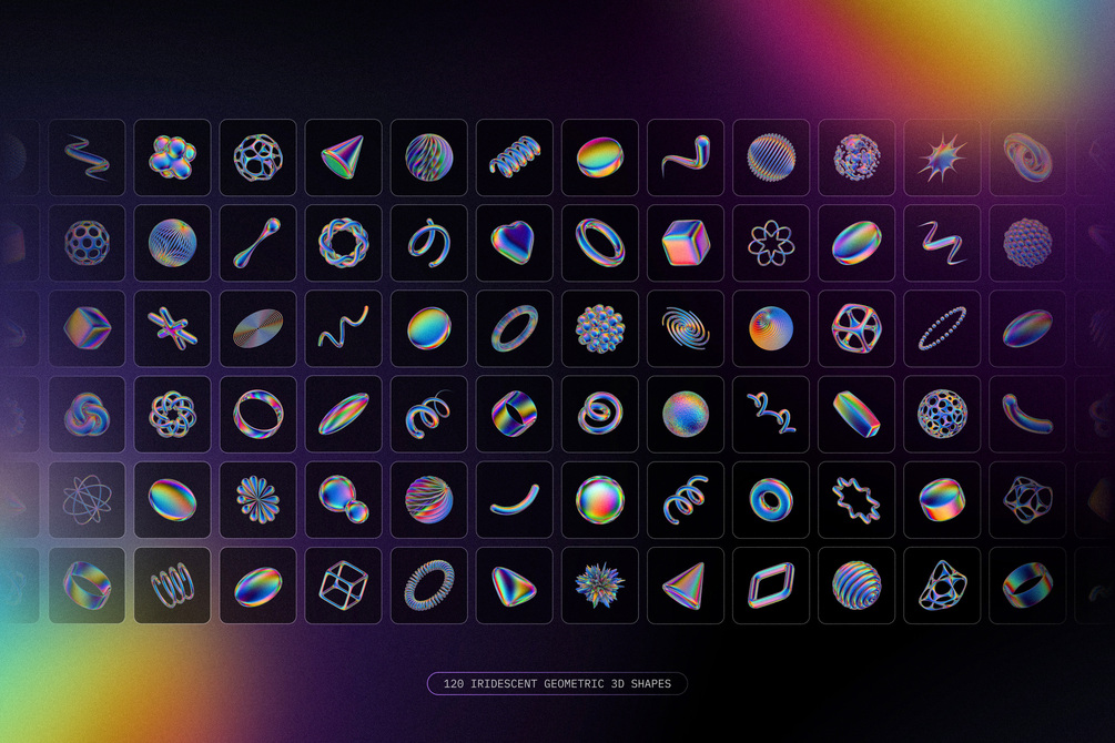 Introducing the 120 Iridescent Geometric 3D Shapes Pack, a captivating collection of abstract multicolor design elements that are bound to add a vibrant touch to your creative work.