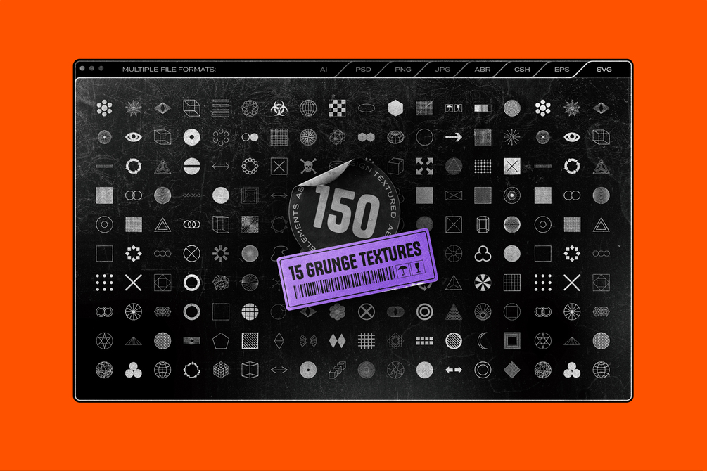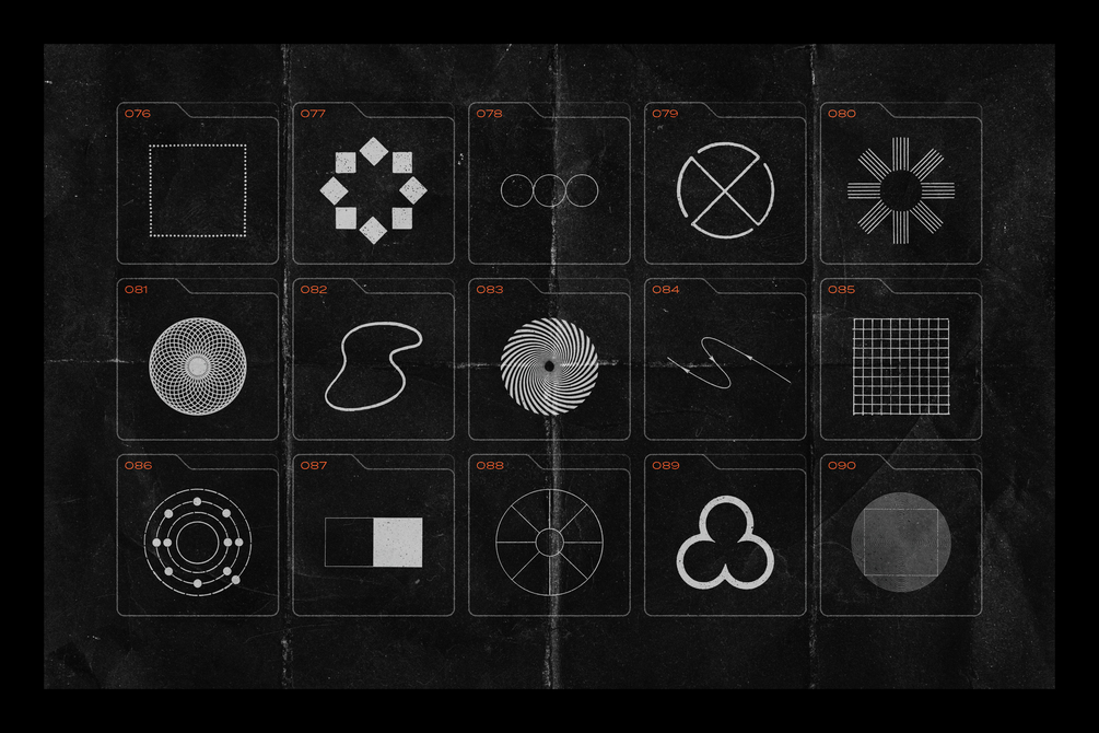 Complementing the geometric shapes, the pack includes 15 grunge textures and overlays. These seamless textures, featuring dust, grit, scratches, and other imperfections, bring a genuine retro feel to your designs.
