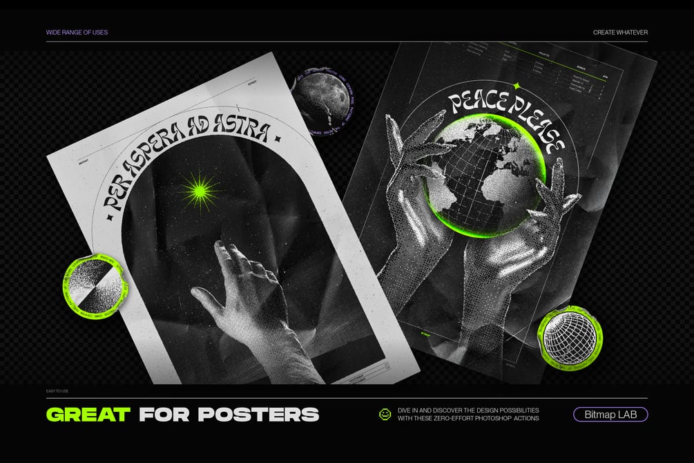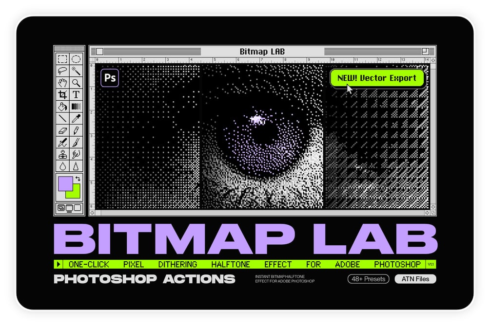 Using advanced Photoshop algorithms, the Bitmap LAB action converts your photos, text, vectors, illustrations, or 3D renders into a stunning array of halftone pixels, also known as dithering.