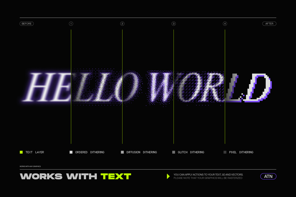With 4 different dithering styles and 48+ versatile actions included as ATN Photoshop files, this tool offers almost limitless creative potential that is really only limited by your imagination. Experiment with a variety of presets and achieve the perfect look for your project.