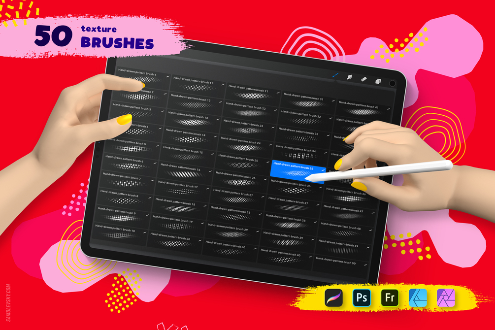 - BRUSHSET File: a set of 50 texture brushes for the Procreate app.