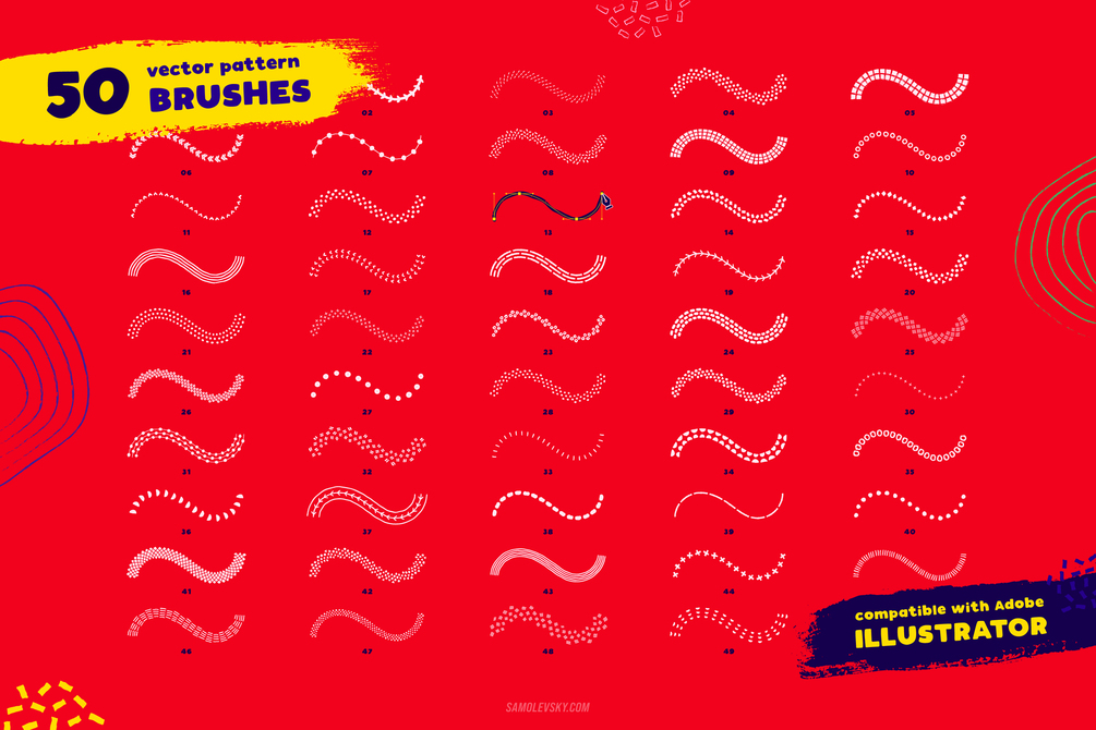 - AI File containing a library of 50 pattern brushes, accessible through Adobe Illustrator's Brushes Panel.