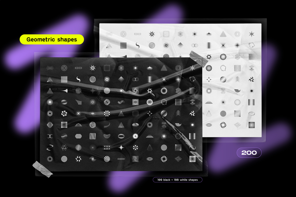 Abstract Design Elements: 100 meticulously crafted abstract design elements in two color options. Enjoy a diverse range of geometric shapes that range from subtly minimalist to boldly avant-garde. These elements are perfect for creating striking visuals that demand attention.