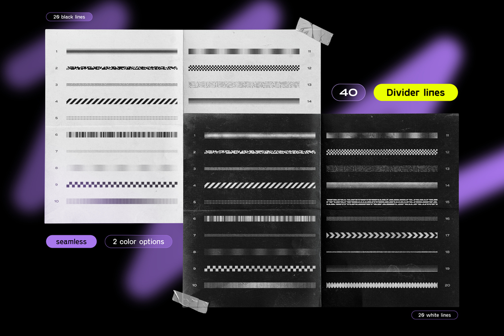 Geometric Divider Lines: 20 carefully designed seamless divider lines, in two color options. They work harmoniously with the abstract elements to structure and enhance the overall composition of your designs.