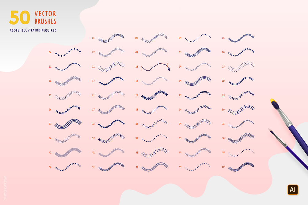 - AI File containing a library of 50 pattern brushes, accessible through Adobe Illustrator's Brushes Panel.