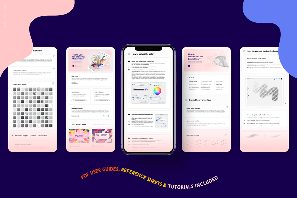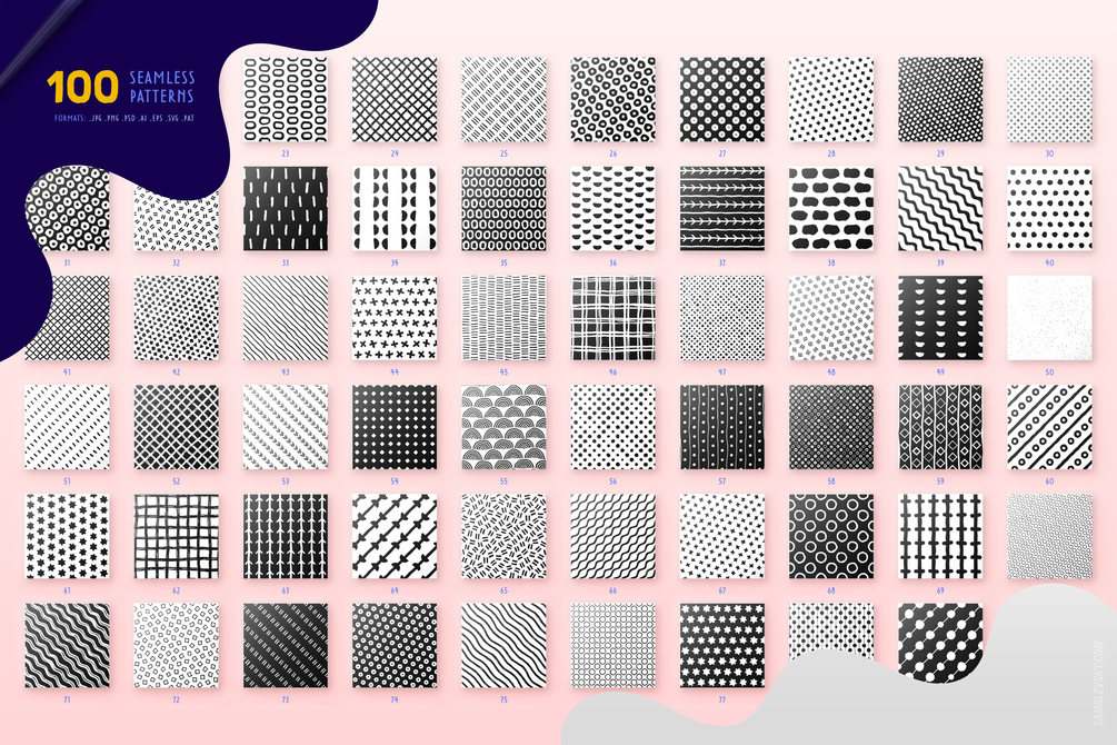 - 100 AI Files: Editable vector seamless patterns, also accessible through Adobe Illustrator's Swatches Panel.