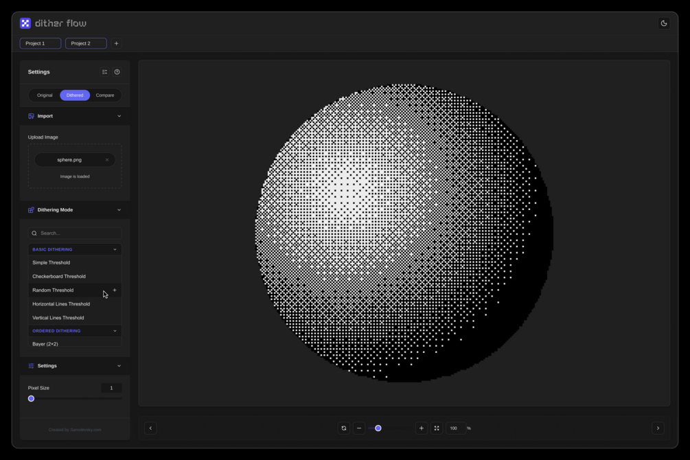 Dither Flow is an application that applies dithering effects to images. Dithering is a technique used to create the illusion of color depth in images with a limited color palette. Originally used in early computer graphics and printing, dithering has become a popular aesthetic choice for retro-style art, game development, and creative design.