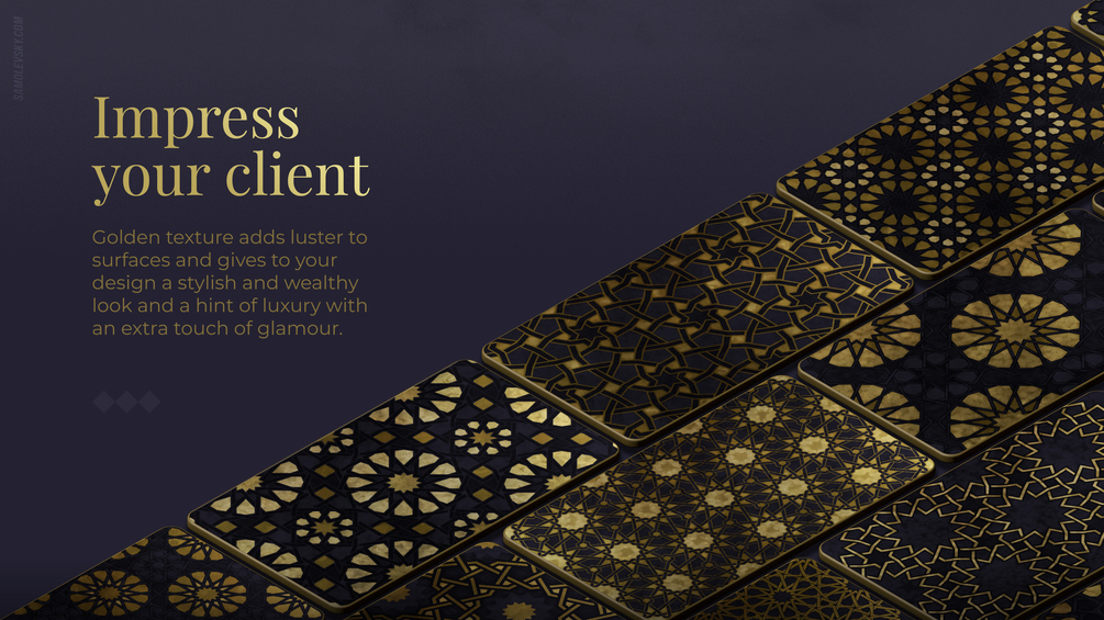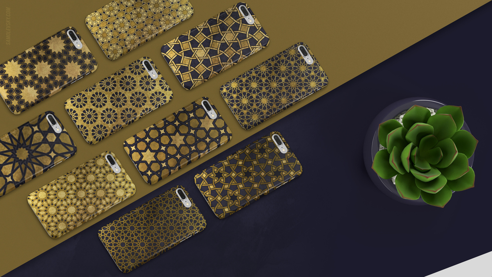 Each piece in this collection is a symphony of geometric elegance, masterfully derived from fundamental shapes like circles, stars, and lines. These patterns, with their intricate arrangements and interlaced designs, are further enhanced by subtle golden textures, handcrafted to infuse your designs with a sense of luxury and oriental glamour.
